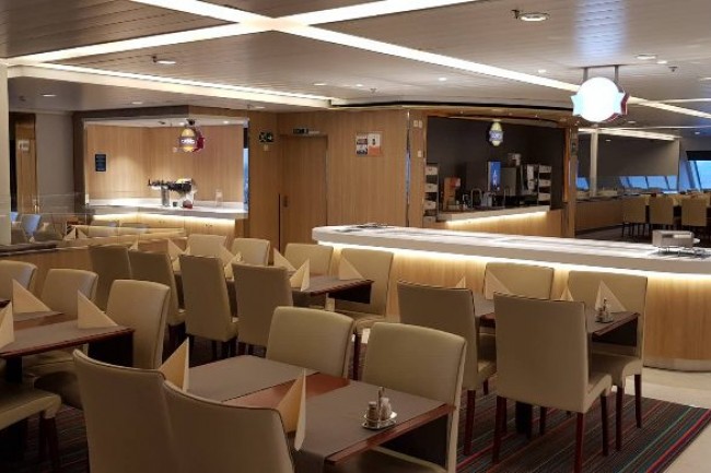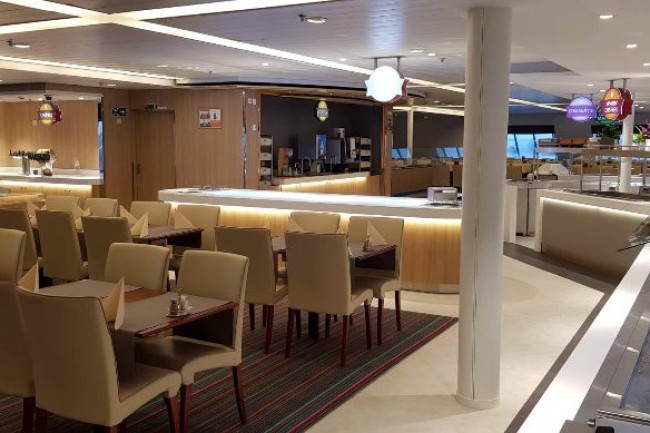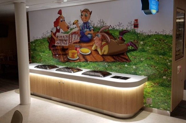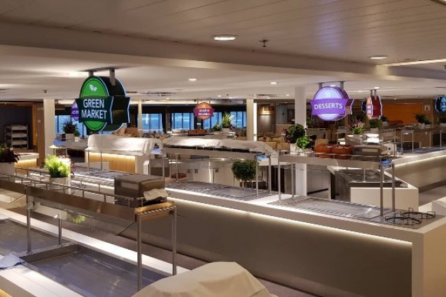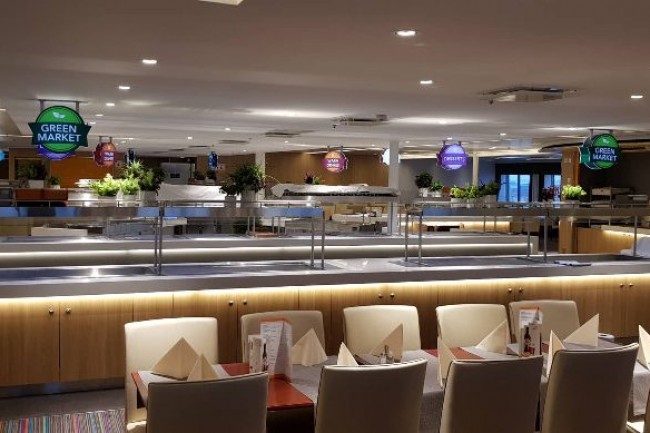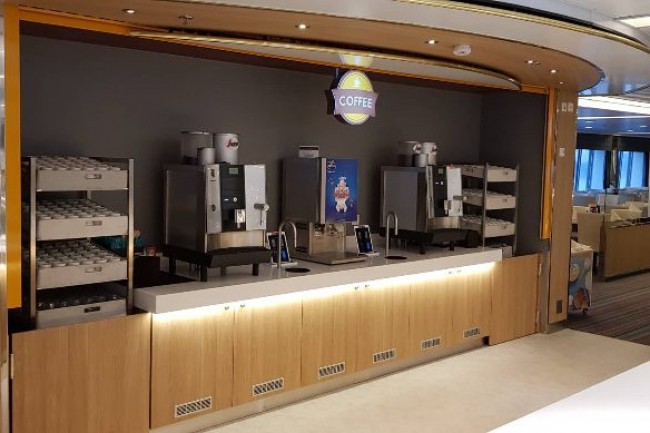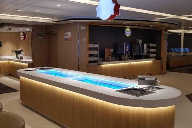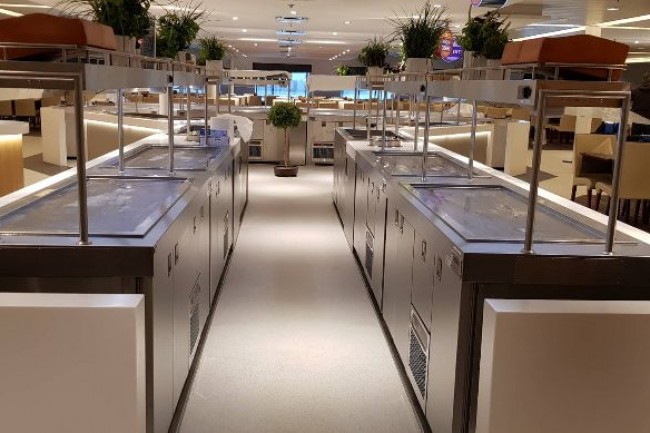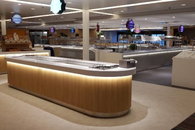 CANTEEN in the cruise ship. Bespoke design counters with integrated equipment, central cooling.